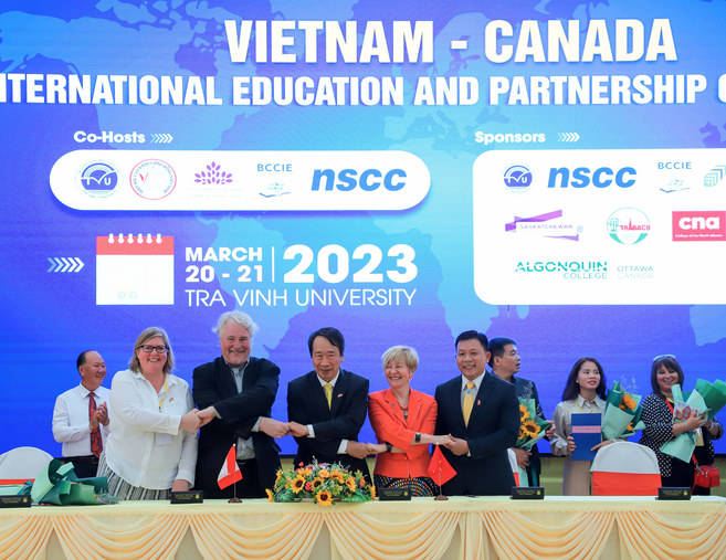 Assoc. Dr. Pham Tiet Khanh, Chairman of the School Council and Assoc. Dr. Nguyen Minh Hoa, Rector of Tra Vinh University, sign an agreement to increase cooperation with Canadian organizations, institutes, and schools.