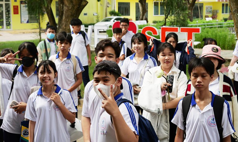 TVU – On December 1st, over 900 high school students from Nhuan Phu Tan High School (Ben Tre); Hermann Gmeiner High School (Ben Tre); Diep Minh Chau High School (Ben Tre); Nguyen Van Con School (Tien Giang); Tam Binh High School (Vinh Long); and Phung Hiep Continuing Education Center (Hau Giang) come to visit and experience the “A day of a student” activity series at Tra Vinh University.